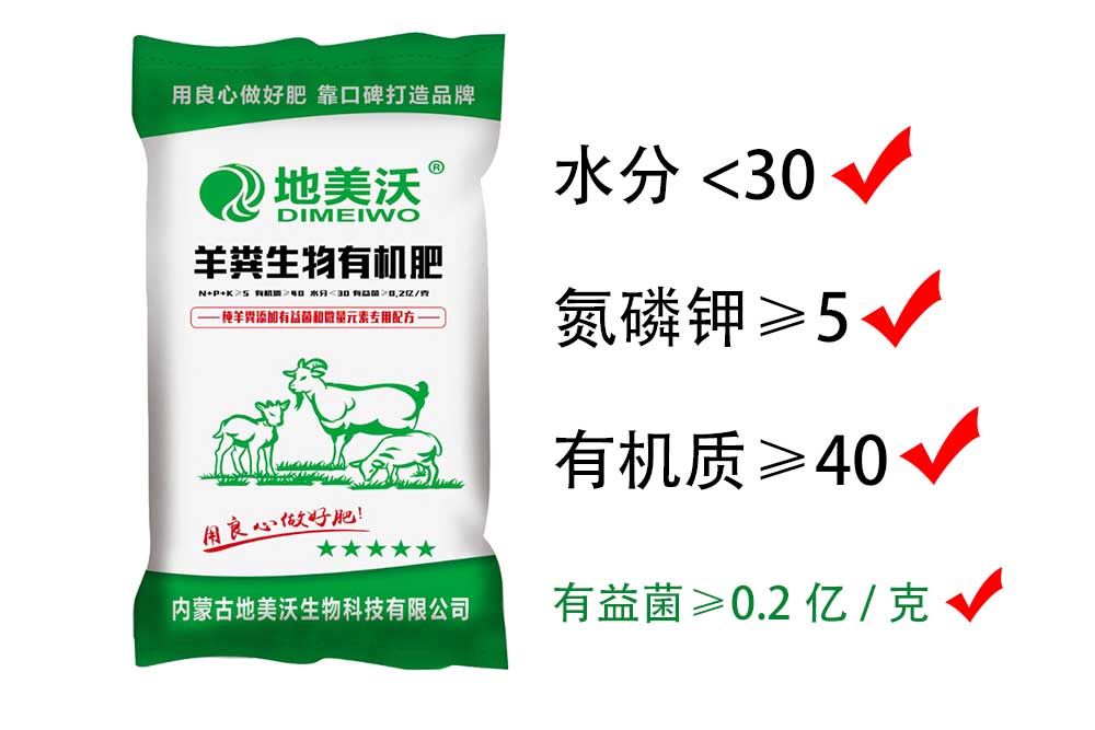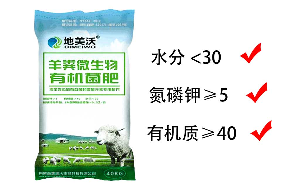 羊糞生物有機肥(菌肥): N+P+K≥5? 有機質(zhì)≥40 水分<30 有益菌≥0.2億/克 在100%發(fā)酵純羊糞的基礎之上,添加腐殖酸、微量元素和幾十種有益菌配制而成,絕不添加其他產(chǎn)品。